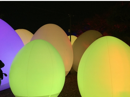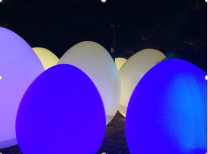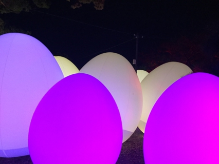 このように色とりどりの卵型の光がたくさん置いてあり幻想的な