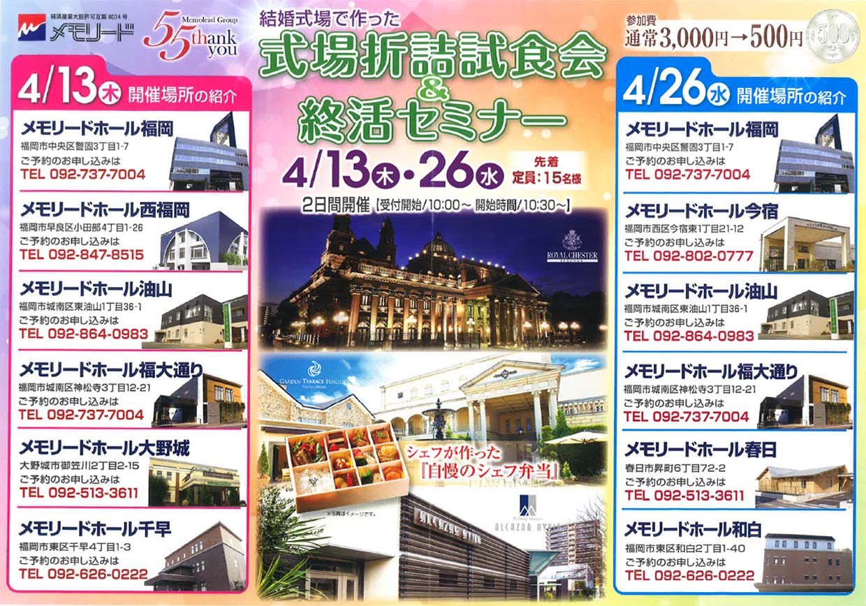 【メモリードホール今宿】式場折詰試食会&終活セミナーのお知らせ - 【公式】ご葬儀、家族葬、社葬ならメモリード福岡。福岡市、大野城市、春日市に19斎場。